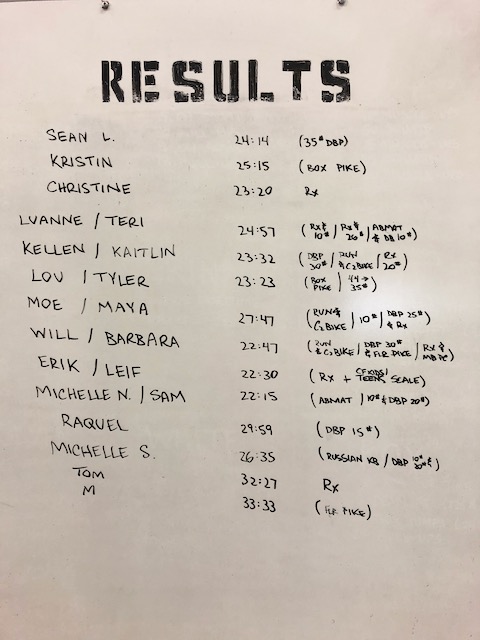 18-15-12-9-6: Row, Med Ball Cleans, KB Swings, Med Ball Sit-ups, Burpees and HSPU
