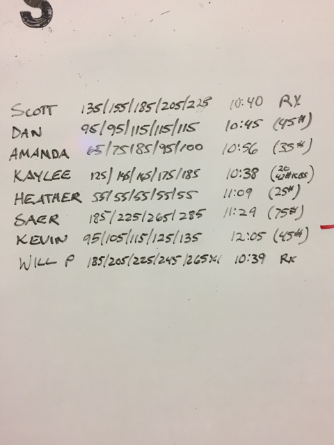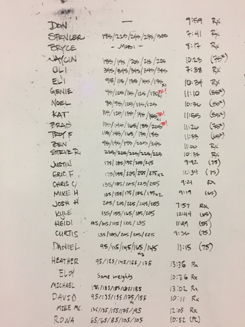 This will be an “engine” and shoulder test as well as ability to transition quickly between movements without wasting time. Expect to break up your deadlifts and wall balls into small, manageable sets with minimal rest rather than larger sets that require standing around. Use a belt if you are used to one. Alternate your grip on the barbell. If you are able to reach the wall then ensure your hips are off the wall and heels are over the line for each rep. Have your judge communicate the count when the rep is clean before you kick down or start the next one. Fast singles can save your shoulders rather than wasting reps and balancing on your head inverted.