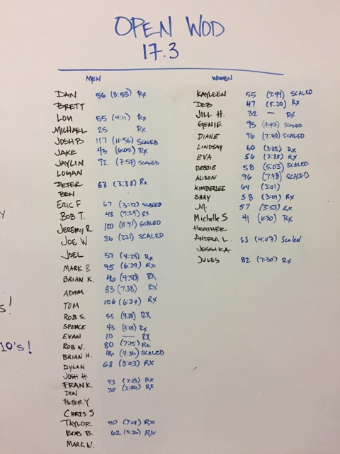 Great energy tonight! Next week for 17.4 plan to make it an after party! Bring drinks, grab some food truck chow next door and hang out after all the heats are done. Frank and Shay will be leading the dance party.