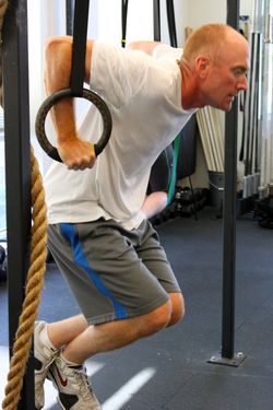 3. Keeping the rings close to the body, lower your body down until the elbow is higher than the shoulder (pictured). This is usually observed to be at the point where the ring touches the armpit area.