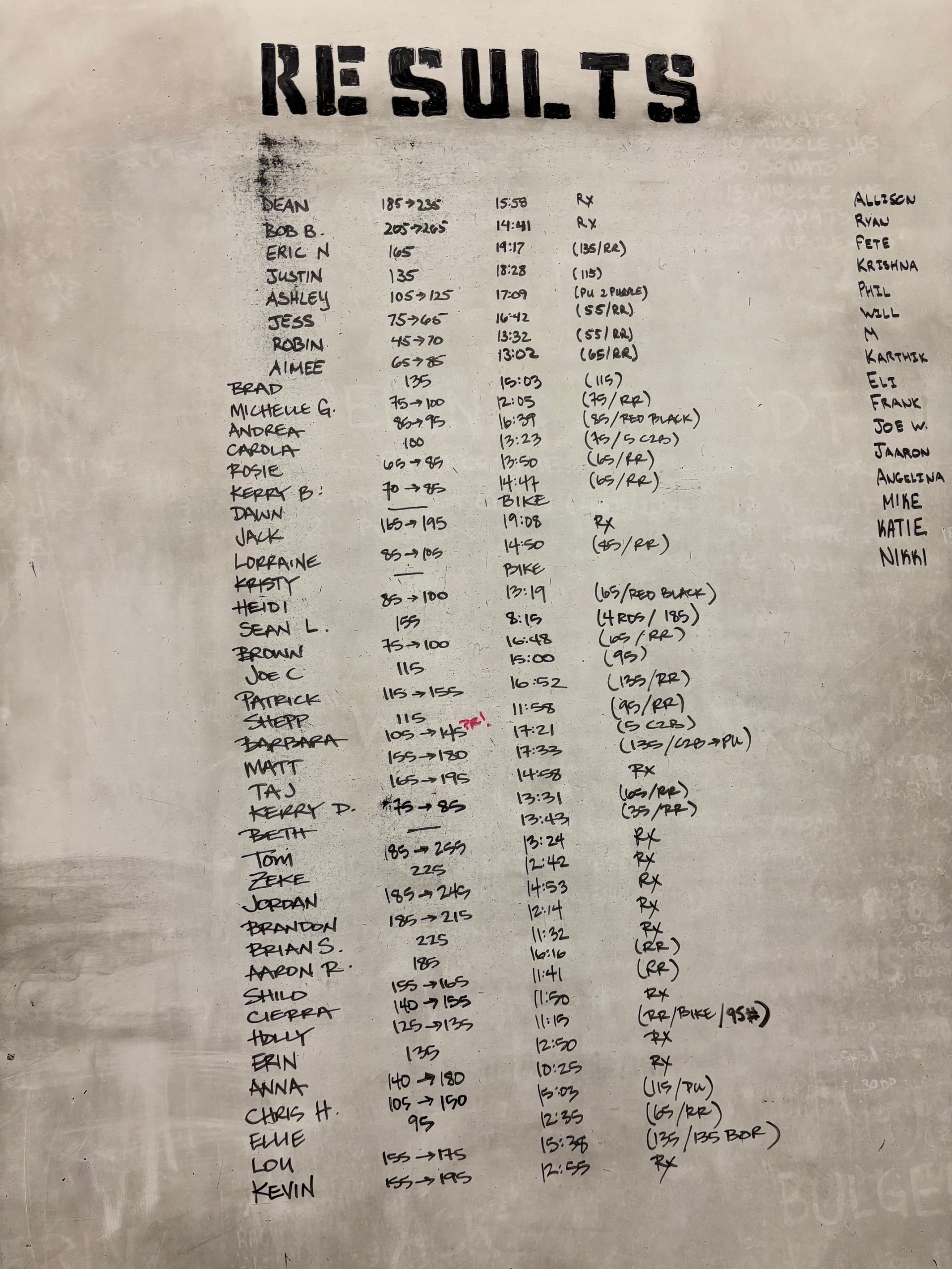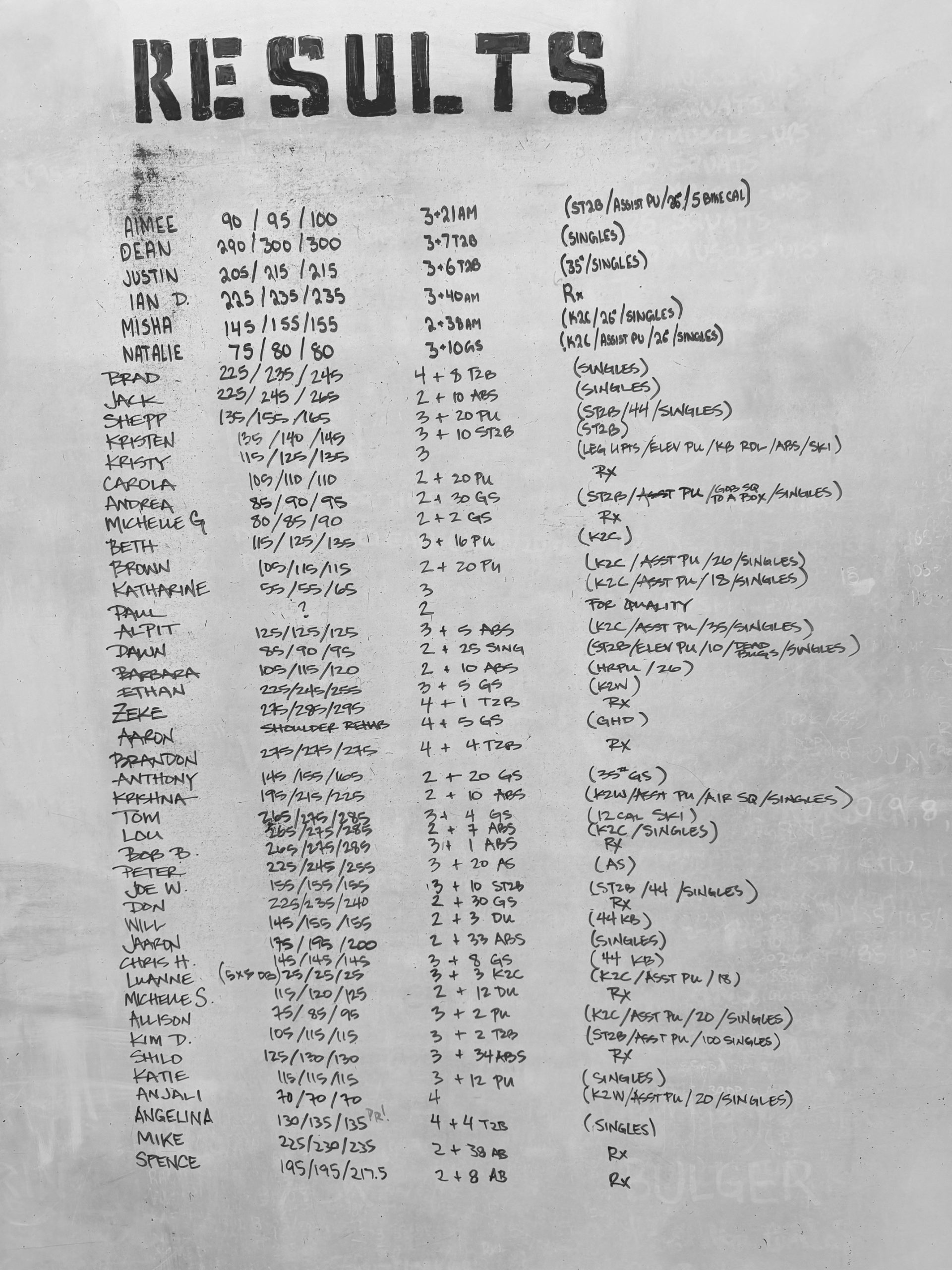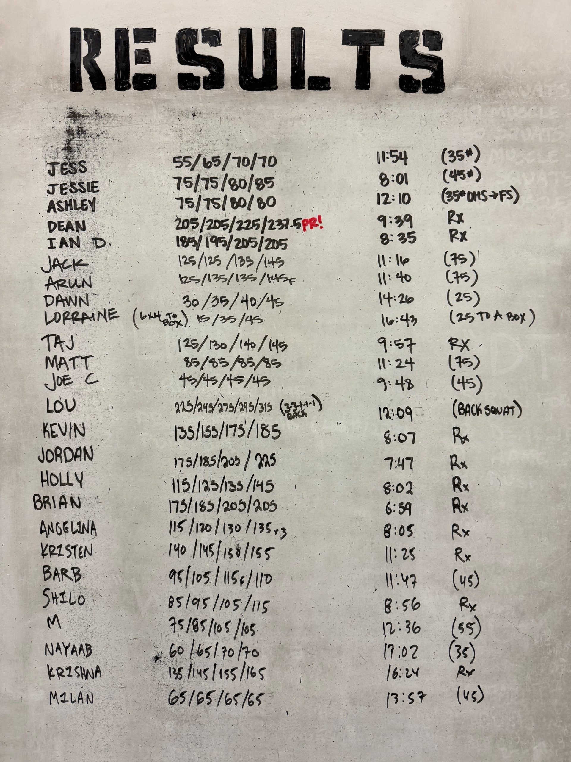 Team WOD: AMRAP 20 mins: Run, Thrusters, and Kettlebell SwingsComplete as many rounds as possible in 20 mins of: