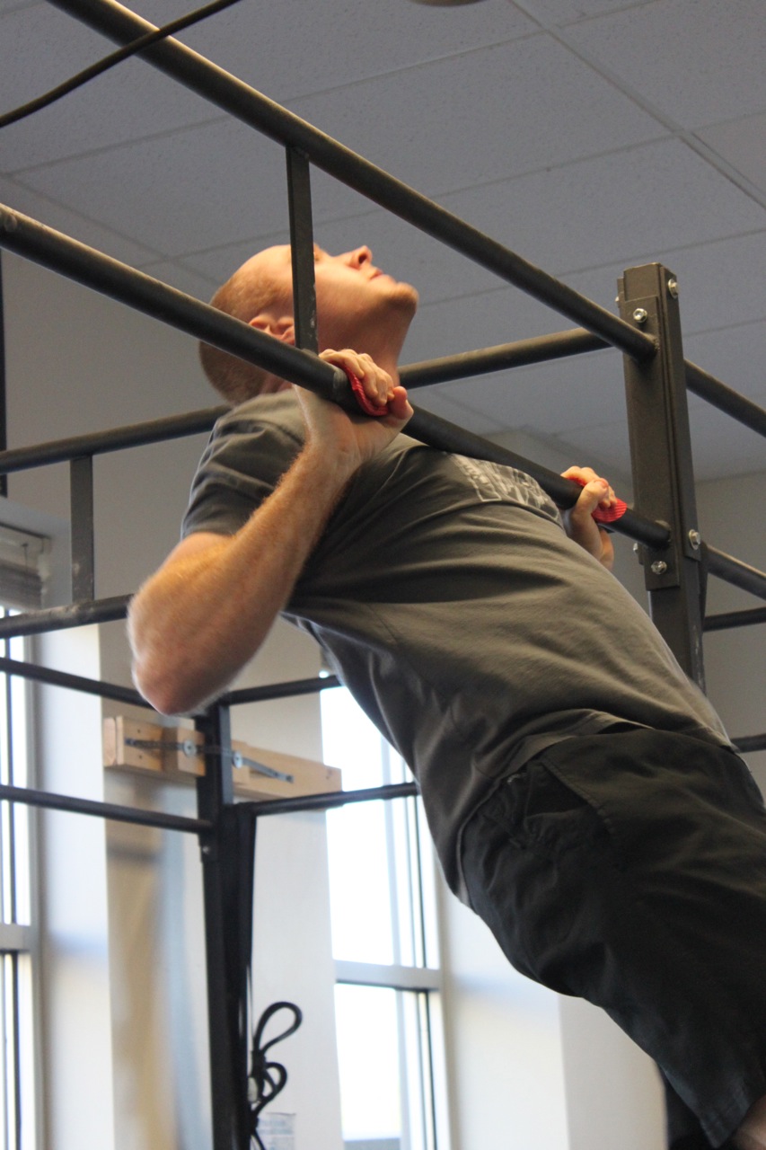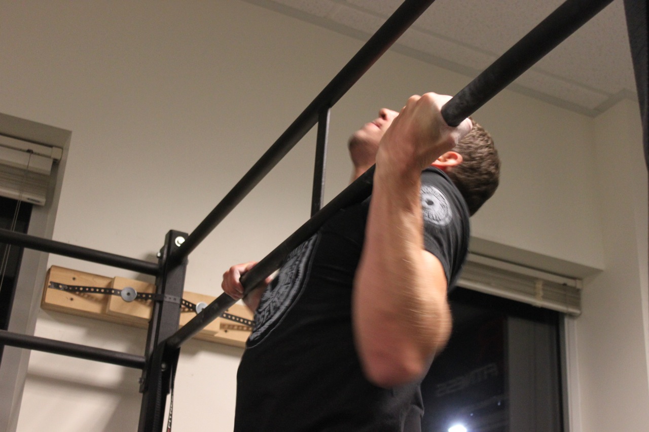 When completing a chest-to-bar pull-up it is necessary to make contact with the chest in which the “target” should be to contact the middle of the chest or below to the bar. To complete this range of motion pull harder with the arms and lats while heaving your chest forward. Leaning the torso back while keeping the feet together will help. As the arms tire consider varying your grip.