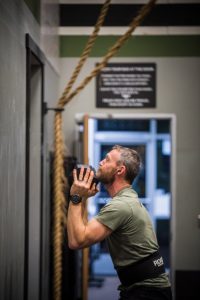Death By – Dumbbell Goblet Thrusters: 2 reps + 2 reps / 1 min