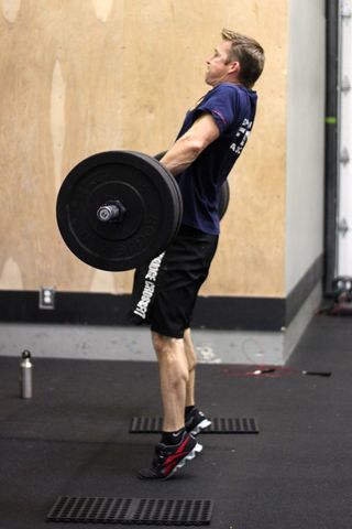 - As you pull off the floor drive through the legs and shrug the shoulders and open the hips
